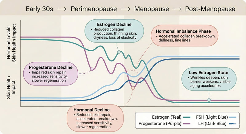 As estrogen and progesterone decline through perimenopause and menopause, skin loses collagen, elasticity, and its ability to repair itself. Dryness increases. Sensitivity rises. Aging accelerates. Yet modern skincare delivers less nourishment at the exact moment skin needs more.